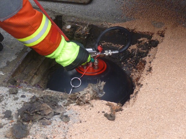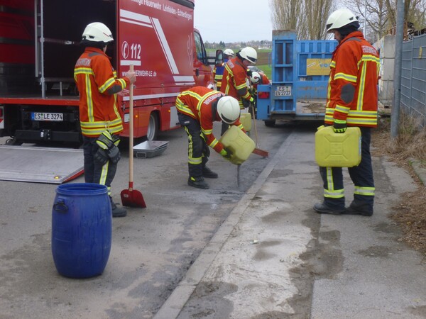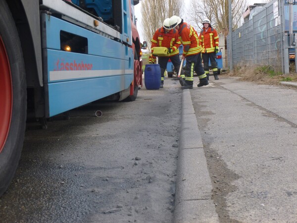 Beim Entladevorgang eines Autotransporters platzte eine Hydraulikleitung. Die Feuerwehr sicherte einen Kanal davor, dass größere Mengen in die Kanalisation laufen. Durch Aufbringen von Ölbindemittel und die anschließende Aufnahme, konnte das Öl abgebunden werden.