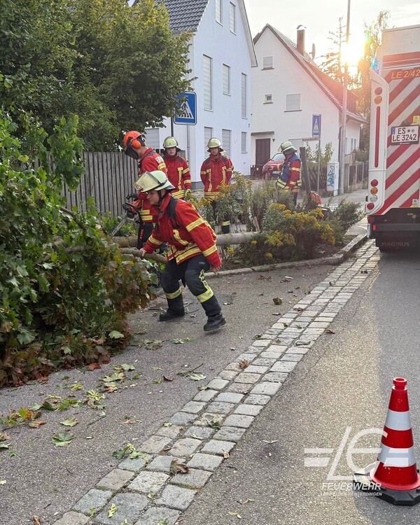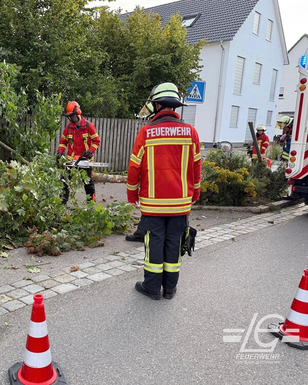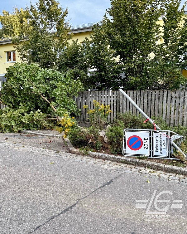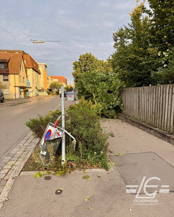 Beseitigung eines umgestürzten Baumes auf Gehweg und Straße nach Verkehrsunfall (Bernhäuser Straße)