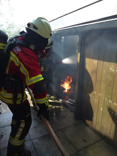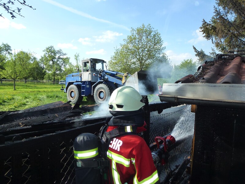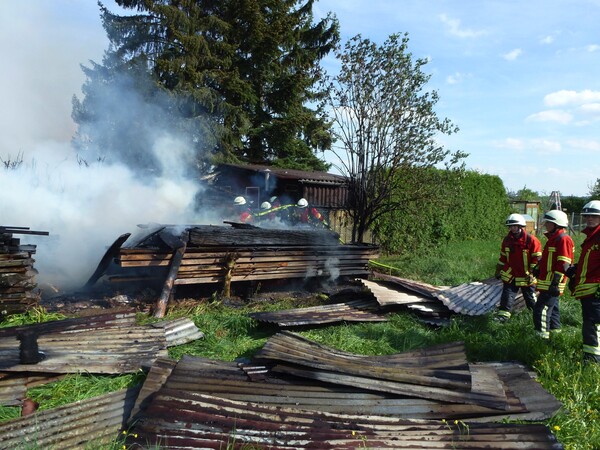 Im Geräteschuppen befanden sich Rasenmäher, Stromaggregat, Betriebsstoffe usw. Ein Übergreifen der Flammen auf das Gartenhaus konnte durch das schnelle Eingreifen der Feuerwehr und den Einsatz von 3 C-Rohren gestoppt werden. Darin befindliche Gasflaschen wurden vorsorglich in Sicherheit gebracht. Die Nachlöscharbeiten beinhalteten eine Dachöffnung am Gartenhaus. Der Holzstapel wurde mit Hilfe eines Radladers der Firma Fauser Baustoffe auseinander gezogen. Verletzt wurde niemand.