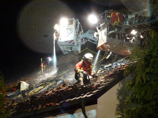 Im weiteren Einsatzverlauf wurde die betroffene Dachhälfte durch die Feuerwehrkräfte unter Atemschutz abgedeckt und die in der Dämmung befindlichen Glutnester abgelöscht. Zur Sicherung der eingesetzten Feuerwehrkräfte auf dem Dach, wurde die Absturzsicherungsgruppe der Feuerwehr eingesetzt. Hierfür wurde die Abteilung Musberg nachalarmiert. Die Abteilung Stetten besetzt ein Löschfahrzeug einsatzbereit im Feuerwehrhaus.