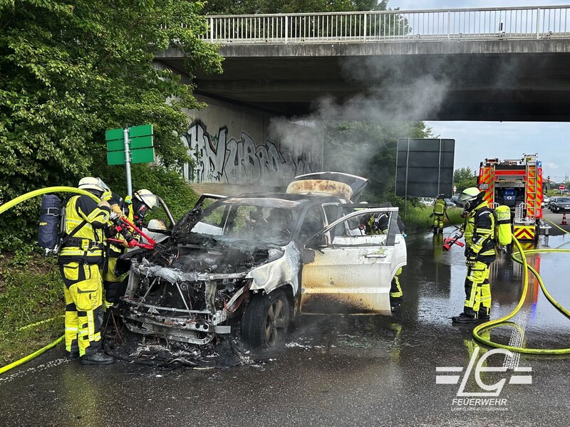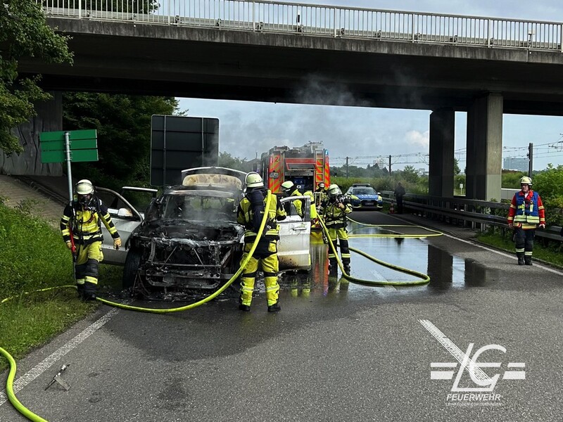 Gemeinsam mit der Flughafenfeuerwehr Stuttgart wurden wir heute zu einem Pkw-Brand gerufen. Direkt nach der Abfahrt der B 27 zum Flughafen war ein Pkw in Brand geraten. Die Kollegen der Flughafenfeuerwehr waren aufgrund der räumlichen Nähe als erstes an der Einsatzstelle und haben die Brandbekämpfung durchgeführt.