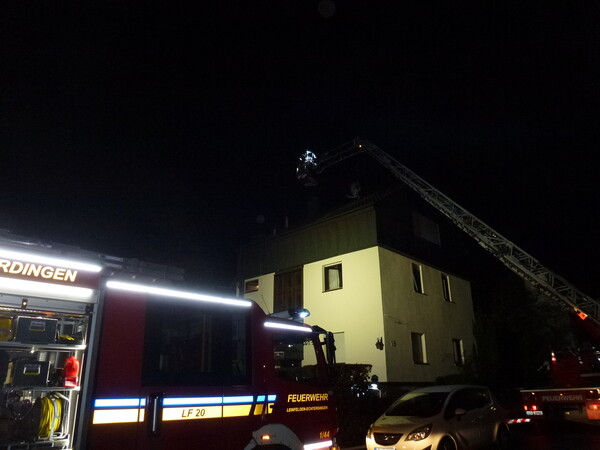 Gemeldeter Kaminbrand bzw. Kellerbrand - Brand eines Holbalkens oberhalb eines Türsturzes im Heizungskeller eines Mehrfamilienhauses aufgrund eines überhitzten Kamins; Ablöschen des Feuers und Kontrolle, auch des Kamins, mittels Wärmebildkamera sowie durch einen Schornsteinfeger (Marktstraße)