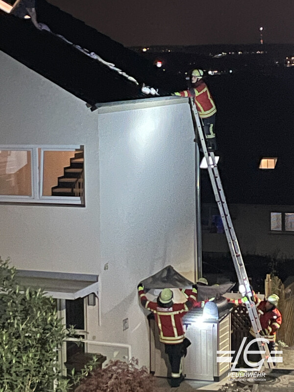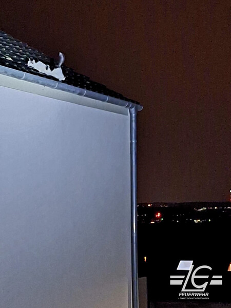 Gestern Nacht haben wir mit Hilfe einer Feuerwehrleiter eine Katze aus einer Regenrinne an einem Reihenhaus gerettet. Rettungsversuche der Bewohner waren bis dahin erfolglos geblieben. Das Tier war verängstigt, konnte aber mit einem berherzten Griff aus seiner Lage befreit und der glücklichen Besitzerin übergeben werden.