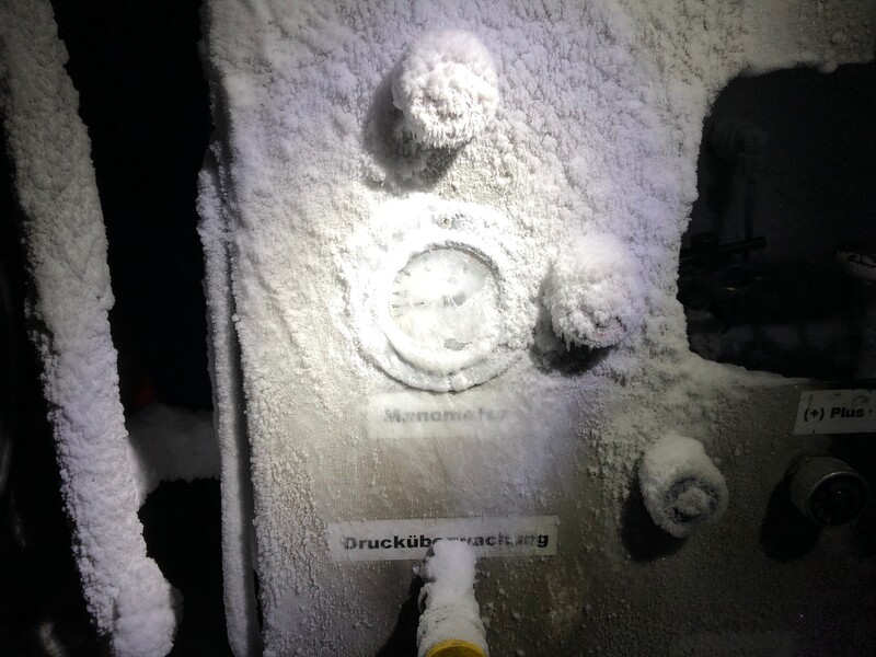Nach Eintreffen eines Firmenmitarbeiters wurde die weitere Vorgehensweise unter den beteiligten Organisationen abgestimmt. Durch Vorgehen eines Atemschutztrupps und einem C-Rohr wurde die Einsatzstelle gesichert. Des weiteren wurde zur schnelleren Verteilung des austretenden Sauerstoffes ein Wasserlüfter eingesetzt. Der Firmenmitarbeiter öffnete kontrolliert ein Überdruckventil. Somit konnte der erhöhte Druck innerhalb des Behälters schnell reduziert werden.