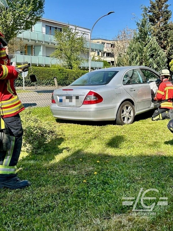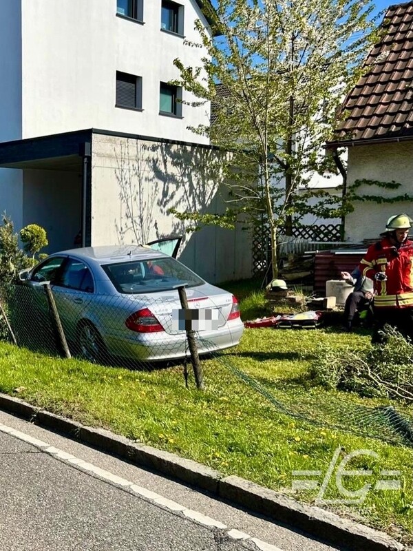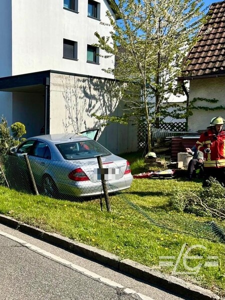 Verkehrsunfall eines alleinbeteiligten Pkw, der zunächst auf einen Lkw aufgefahren und aufgrund des Aufpralls von der Fahrbahn abgekommen war. Dabei durchbrach dieser einen Gartenzaun und war an einem Carport zum Stehen gekommen (Tübinger Straße)