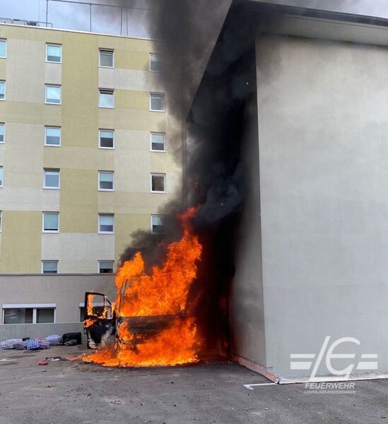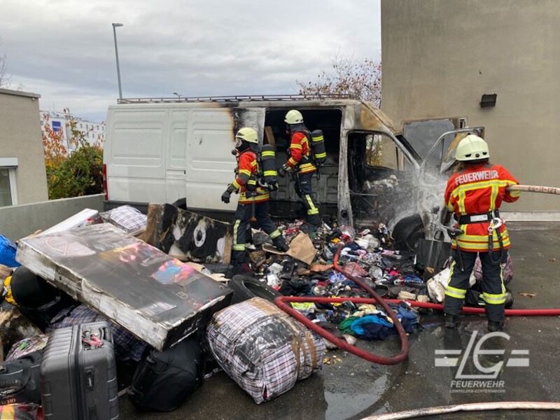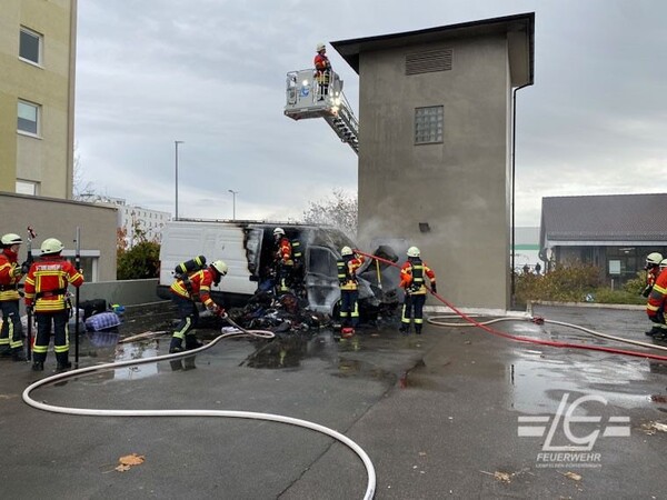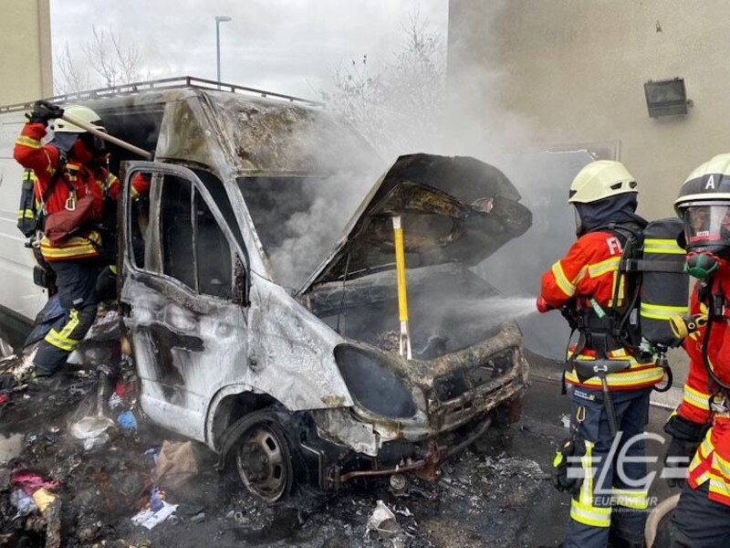 Der Transporter parkte direkt an einem Gebäude welches einer Trafostation ähnelte. Das Gebäude erwies sich glücklicherweise nach einer ausführlichen Erkundung nicht als Trafostation, es war hier jediglich die Notstromversorgung eines angrenzenden Hotels untergebracht. Da der Transporter auf der gesamten Ladefläche mit Hilfsgütern beladen war, musste diese von der Feuerwehr ausgeräumt und die Ladung teilweise abgelöscht werden. Die Feuerwehr setzte für die Löscharbeiten mehrere Trupps unter Atemschutz ein. Zur Kontrolle des angrenzenden Gebäudes wurde die Drehleiter benötigt. Nach Rückkehr in die Feuerwehrhäuser und Ausrüstung der Fahrzeuge konnte der Einsatz gegen 14 Uhr beendet werden (Heilbronner Straße).