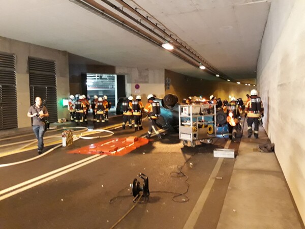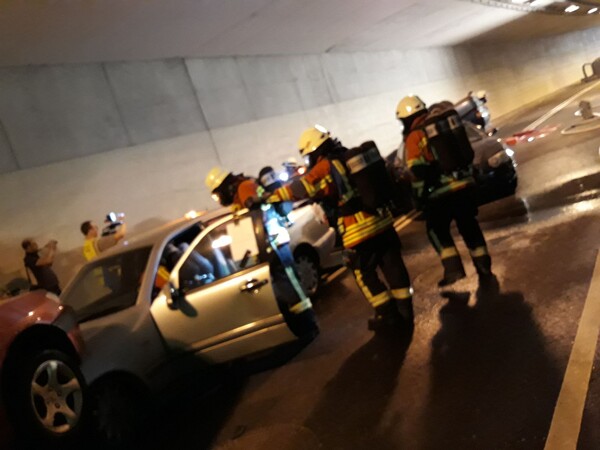 Großeinsatz an der Messe? Ja – aber glücklicherweise nur zum Zwecke der Übung. Am vergangenen Samstag kurz vor 14 Uhr ging bei der Freiwilligen Feuerwehr der Alarm ein: Frontalzusammenstoß mit Verletzten im Tunnel unter der Messe. Zwei Autos liegen auf dem Dach. Rauch quillt aus dem Tunnel. 70 Feuerwehrmänner und -frauen aller vier Abteilungen in der Stadt fuhren zum Unfallort und trafen dort mit der Messe-Werksfeuerwehr zusammen. Unterstützt wurden sie vom Ortsverband des DRK. Jetzt galt es, den Ernstfall zu üben, nämlich die sogenannte Stoßtrupptaktik. Sie wurde für Unglücksfälle in Tunneln entwickelt. In speziell zusammengestellten kleineren Rettungseinheiten zu fünft wird systematisch vorgegangen: die Situation vor Ort erkundet, zuerst der Brand gelöscht (was in einer Tunnelröhre wegen der Rauchentwicklung und Hitze an erster Stelle steht), und dann die Rettung der Verletzten in die Wege geleitet. Im Tunnel unter der Messepiazza etwa musste dazu mittels einer Rettungsschere und einem Spreizer die Türe eines Autos geöffnet werden (Foto oben). Der Einsatz am Samstag lief zur Zufriedenheit der Feuerwehrkommandanten reibungslos ab. Davon konnte sich auch Erste Bürgermeisterin Eva Noller überzeugen, die bei der Übung zugegen war.
