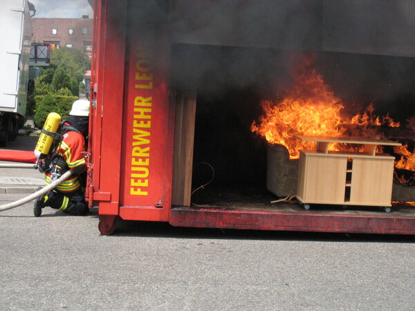 Wie schnell eine Kerze, die versehentlich auf ein Sofa fällt, ein ganzes Wohnzimmer in Flammen setzen kann, wurde anschaulich am Zimmerbrandsimulator der Feuerwehr Leonberg den erstaunten kleinen und großen Festbesuchern demonstriert. Hierbei wurde ganz nebenbei praktisch auch die lebensrettende Investition von Rauchwarnmeldern in Wohnungen aufgezeigt. Die Jugendfeuerwehr zeigte in einer kleinen Übung ebenfalls zum Thema Zimmerbrand ihr Können. Bei dieser Vorführung übernahm kurzerhand auch das neue Waldbrandtanklöschfahrzeug der Feuerwehr Filderstadt eine unterstützende Wasserversorgungsrolle. Danke an Vater und Sohn Schneider von der Abt. Plattenhardt.