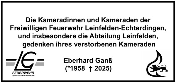 Wir treffen uns zur Trauernfeier am Montag, den 22. Dezember 2025, um 10:45 Uhr am Waldfriedhof Leinfelden in Ausgangsuniform.